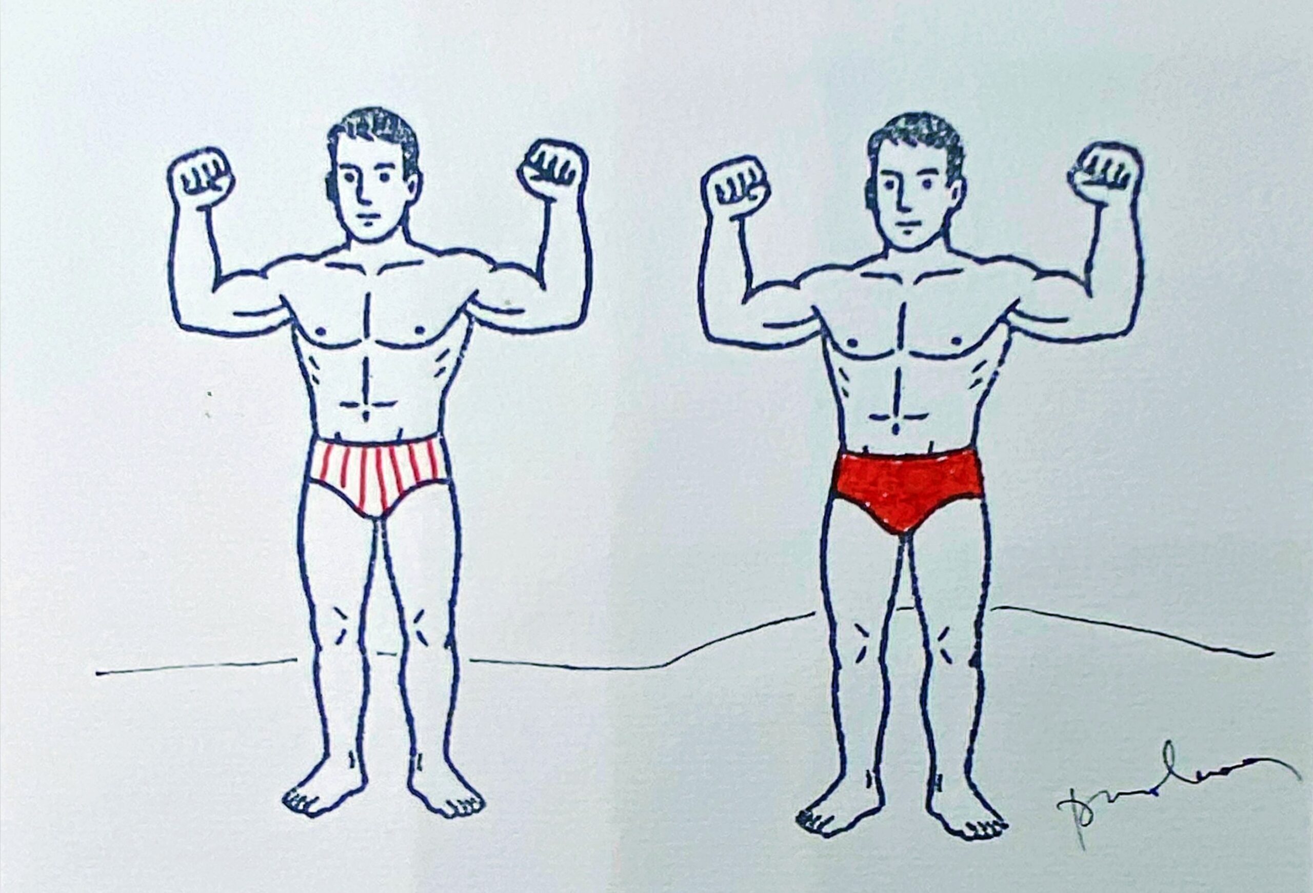 2 beaux nageurs, un en slip rayé de rouge l’autre en slip rouge