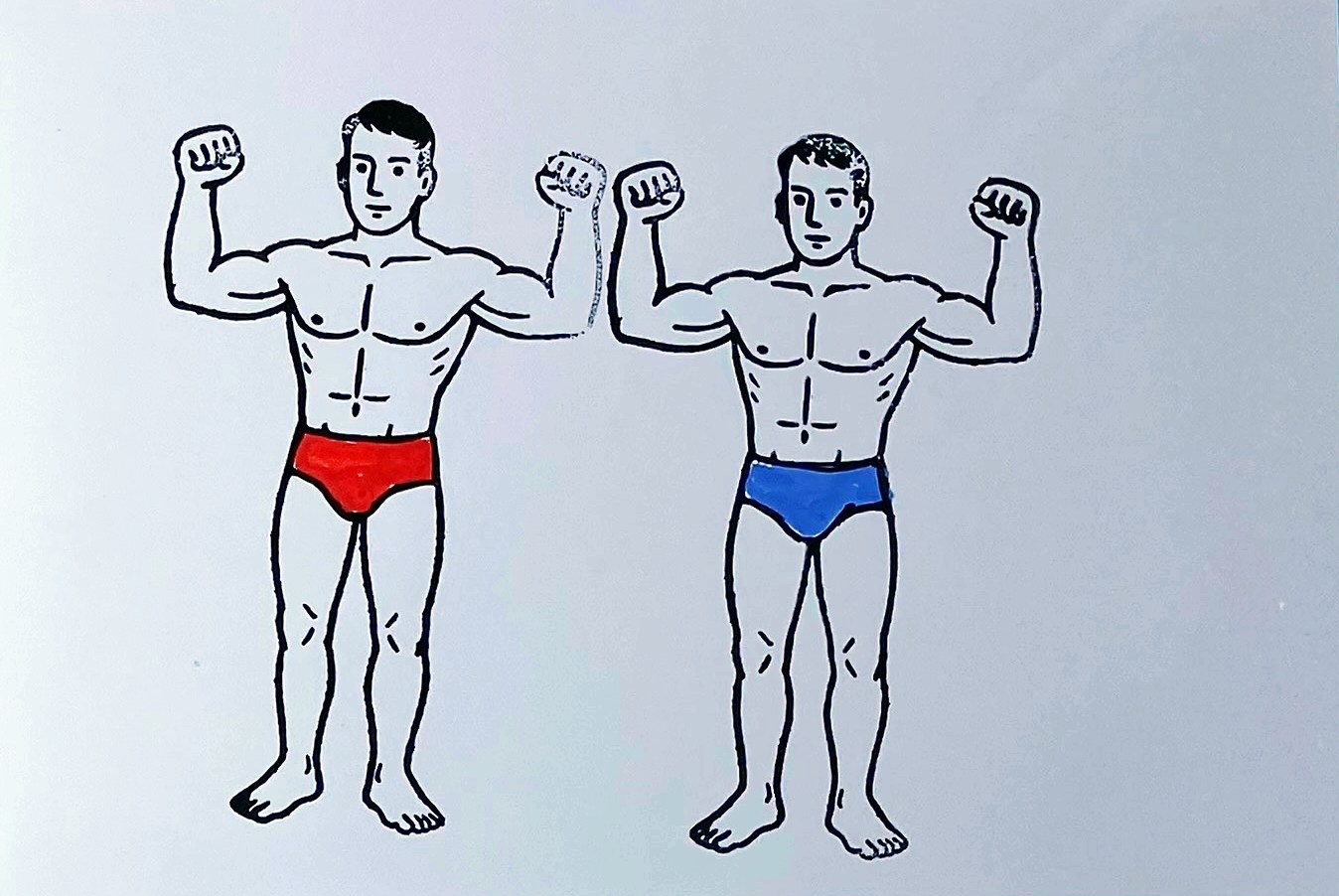 Dans la série Les Beaux Nageurs, « 2 beaux nageurs, un en slip rouge l’autre en slip bleu ». Tampon encre noire sur papier photo Canon brillant format format 10 cm x 15 cm. Feutres de couleur pour les maillots. Signé et daté au dos. Sur demande sur la face. Vendu avec passe partout 18cm x 12,5 cm