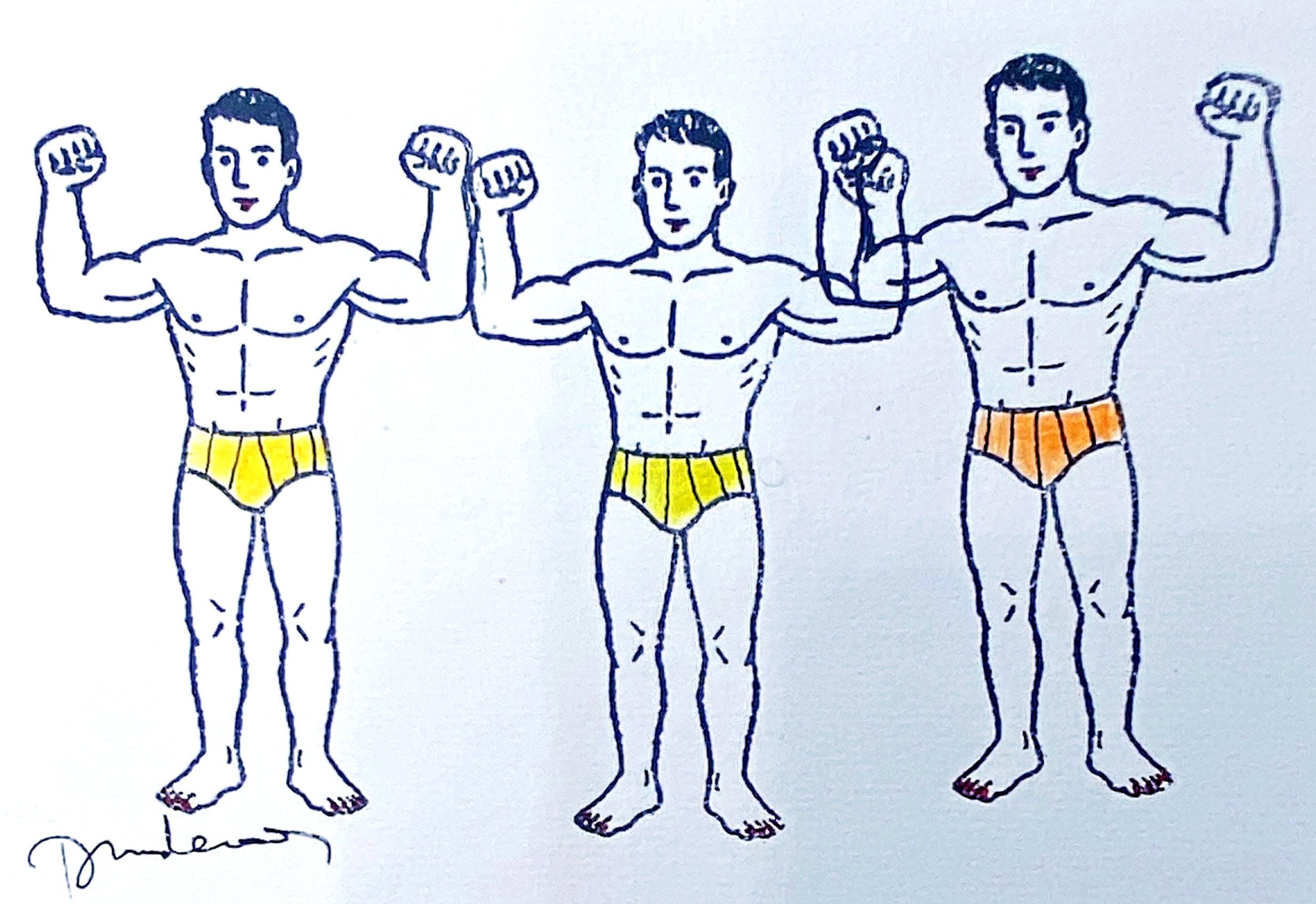 3 beaux nageurs en slips à rayure, jaune et orange