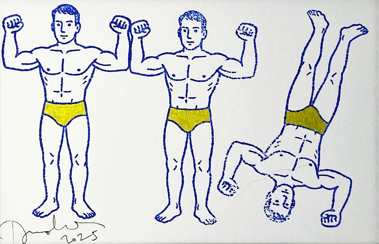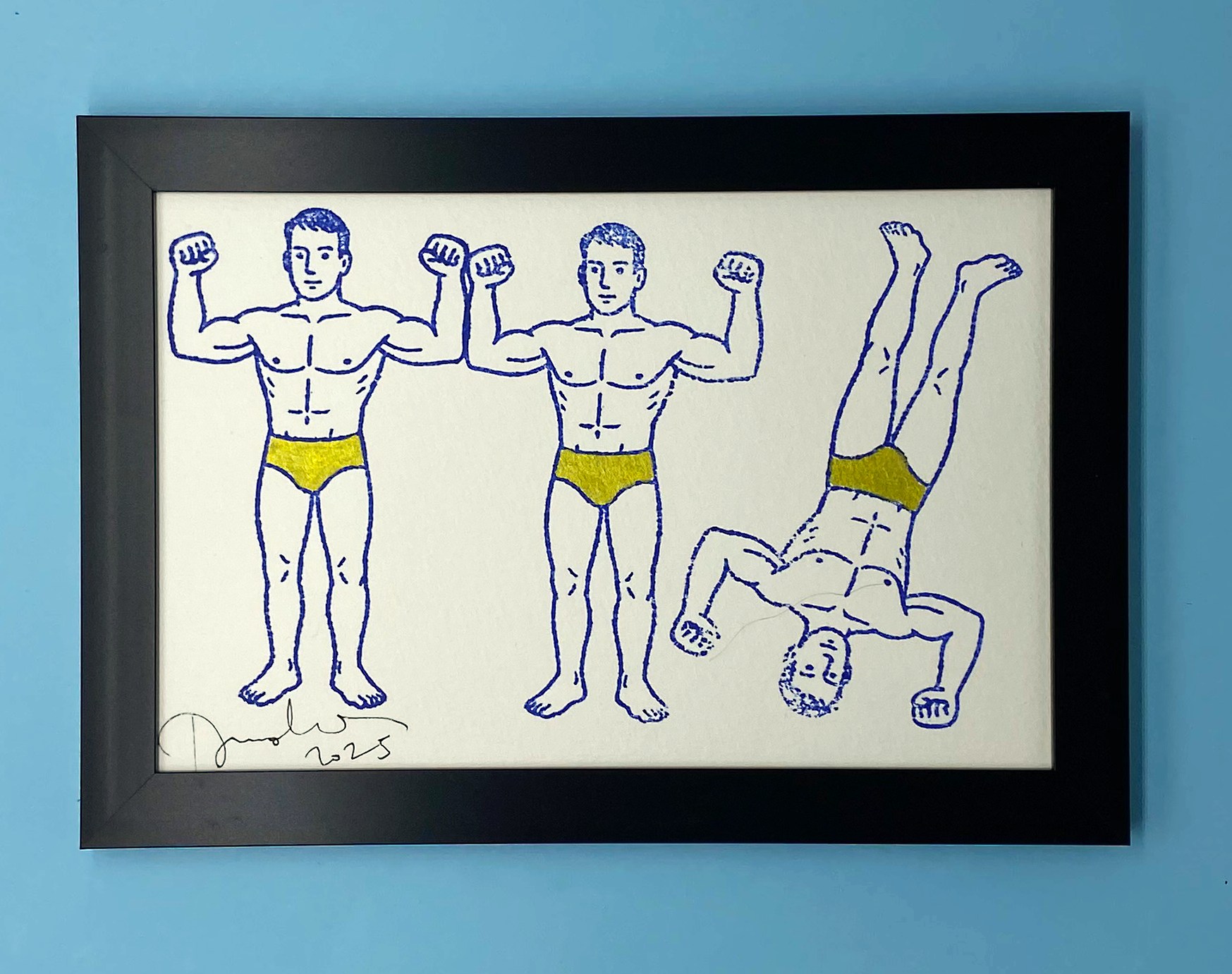 Petit format représentant 3 beaux nageurs en slips d’or. Pièce unique. Tampon, encre bleue et feutre sur Papier dessin aquapad de Clairefontaine 300 g/m2. Format encadré 16,5 cm x 11,5 cm. Vendu avec cadre noir.