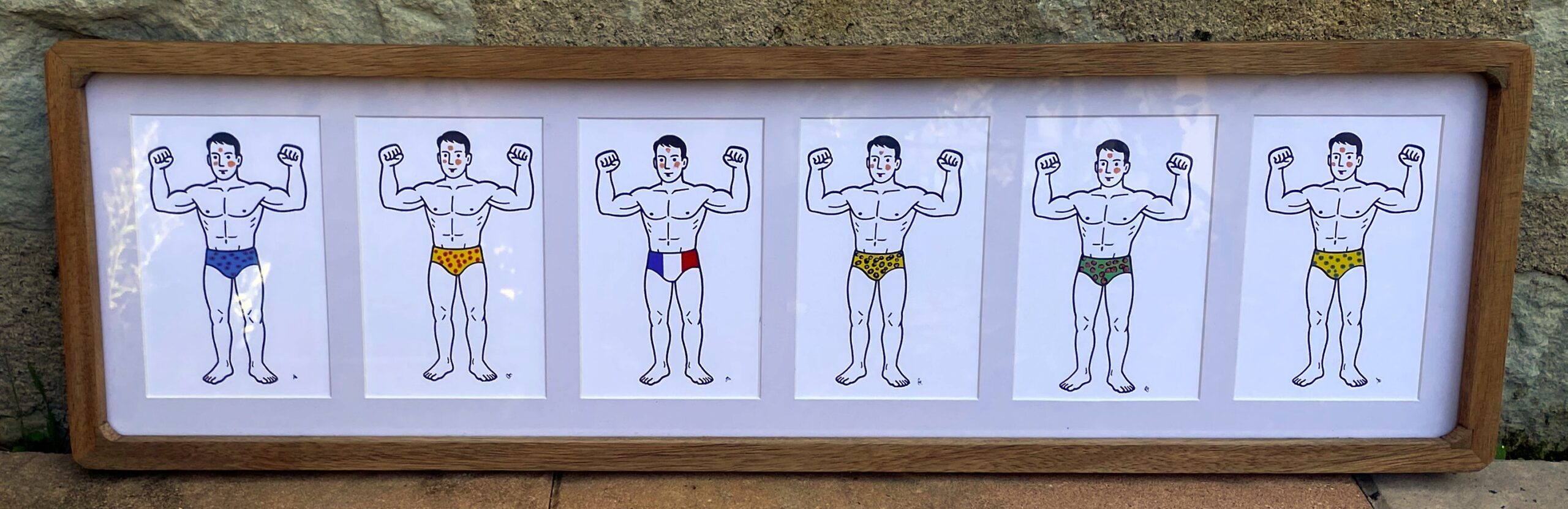 Dans la série Les Beaux Nageurs, Encadrés (bois +verrre) 6 beaux nageurs prennent la pose. 6 versions différentes du beau nageur. Impression jet d’encre sur papier Hahnemühle Photo Glossy 260 gsm. feutres acryliques de couleur. SIgnés au dos. format du cadre : 70 cm de large sur 21 de haut. Oeuvre originale 2025