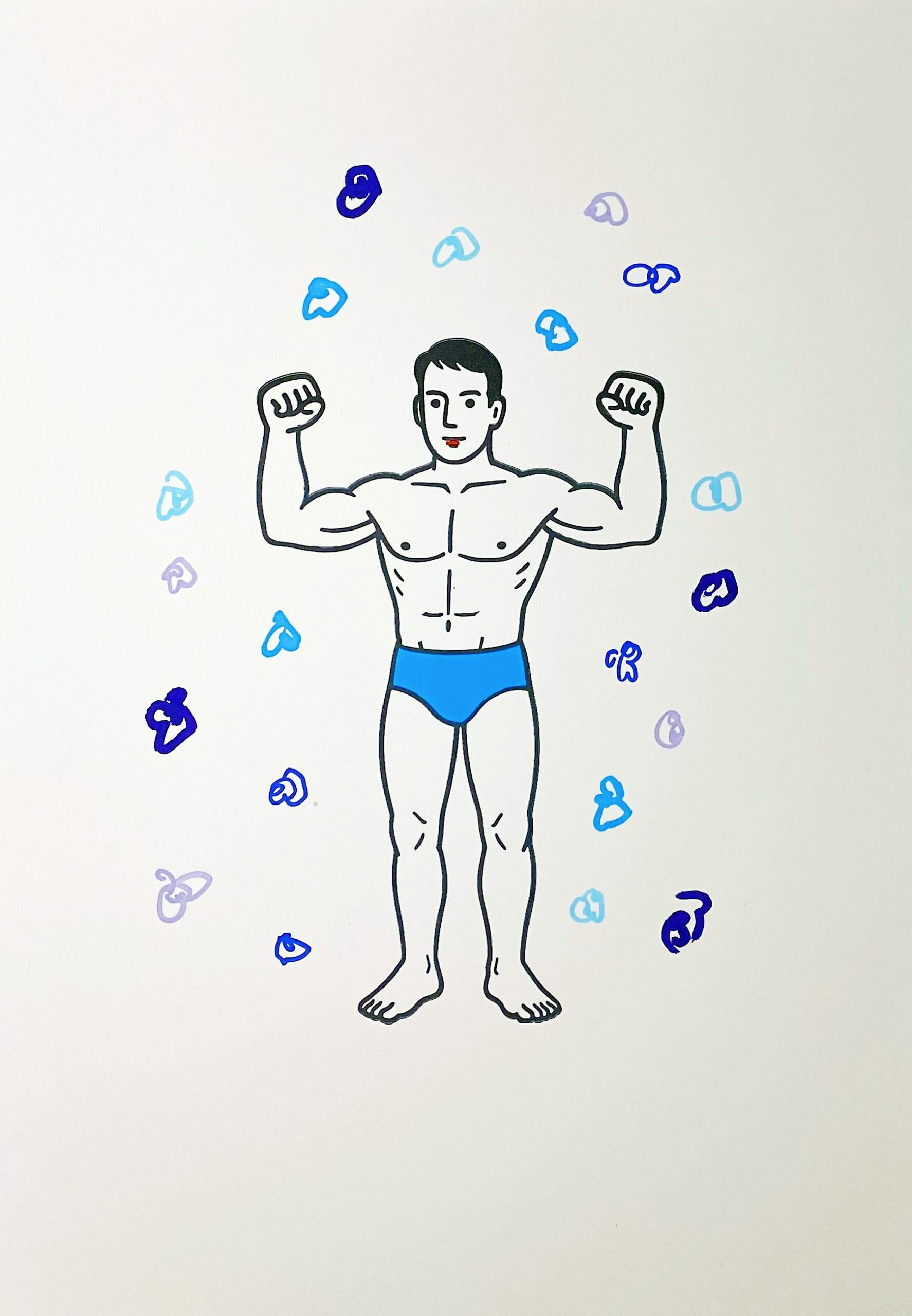 Dans la série Les Beaux Nageurs, création unique 2025 « Le beau nageur entouré de fleurs bleues ». Impression jet d’encre réhaussé avec des feutres de couleur bleue, sur papier photo mat Ilford Studio, format A4, 235 g/m², à séchage instantané (« Instant Dry »), sur base RC (Resin Coated) . Signé et daté au dos, sur demande sur le devant.