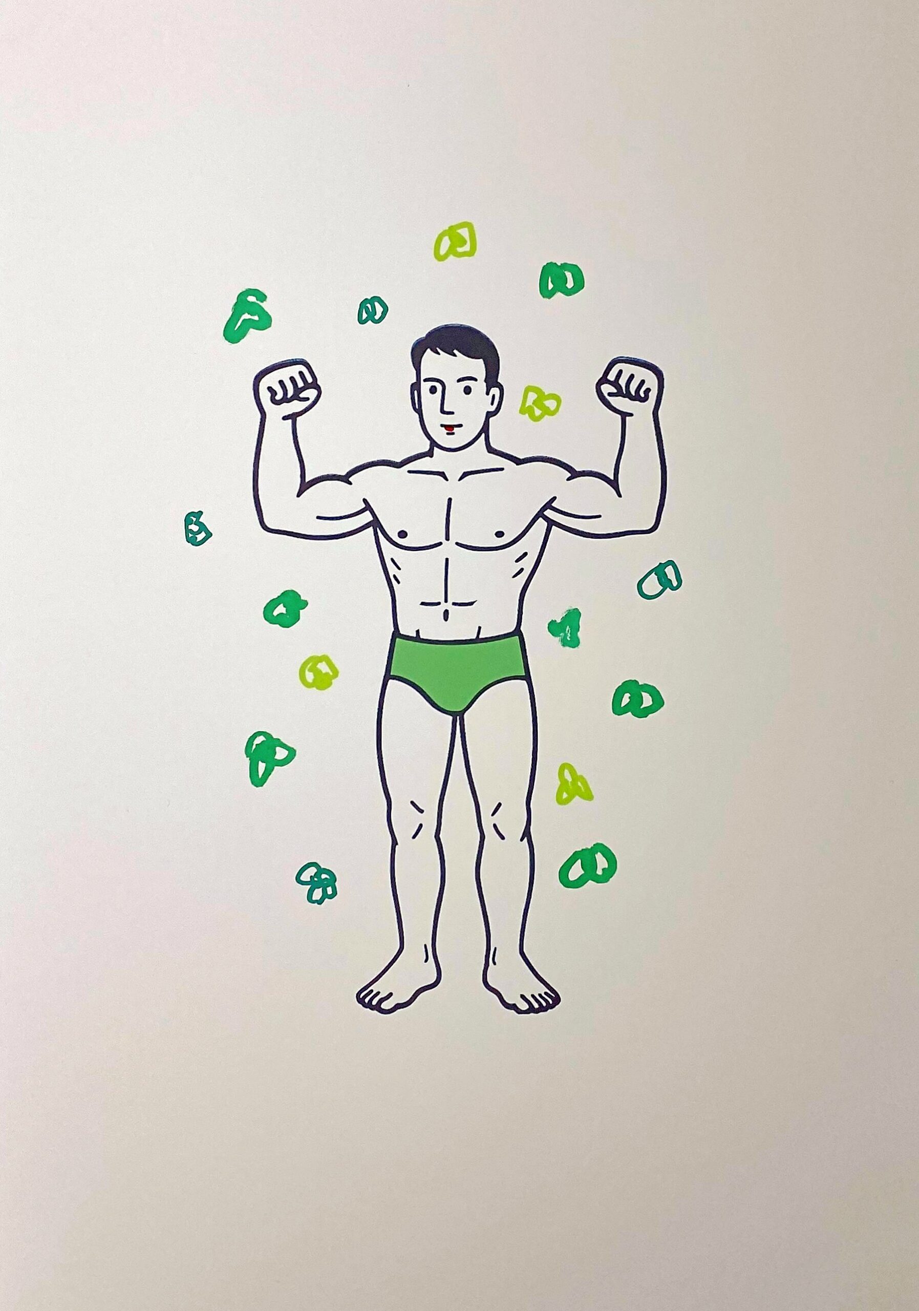 Dans la série Les Beaux Nageurs, création unique 2025 « Le beau nageur entouré de fleurs vertes ». Impression jet d’encre réhaussé avec des feutres de couleur verte, sur papier photo mat Ilford Studio, format A4, 235 g/m², à séchage instantané (« Instant Dry »), sur base RC (Resin Coated) . Signé et daté au dos, sur demande sur le devant.
