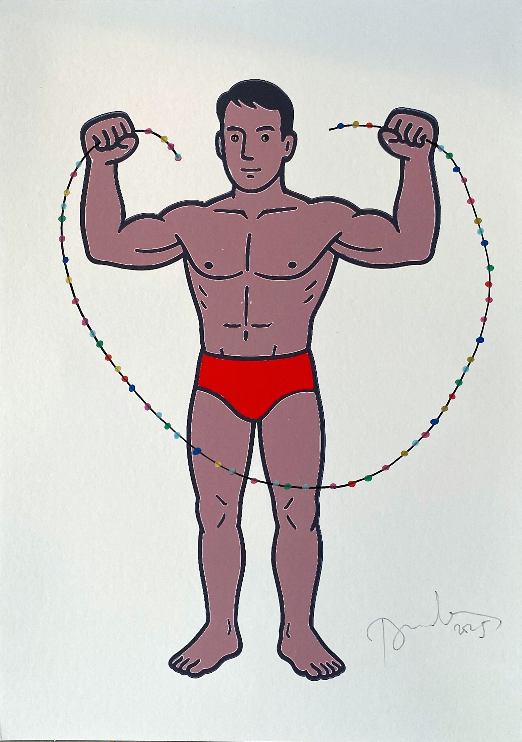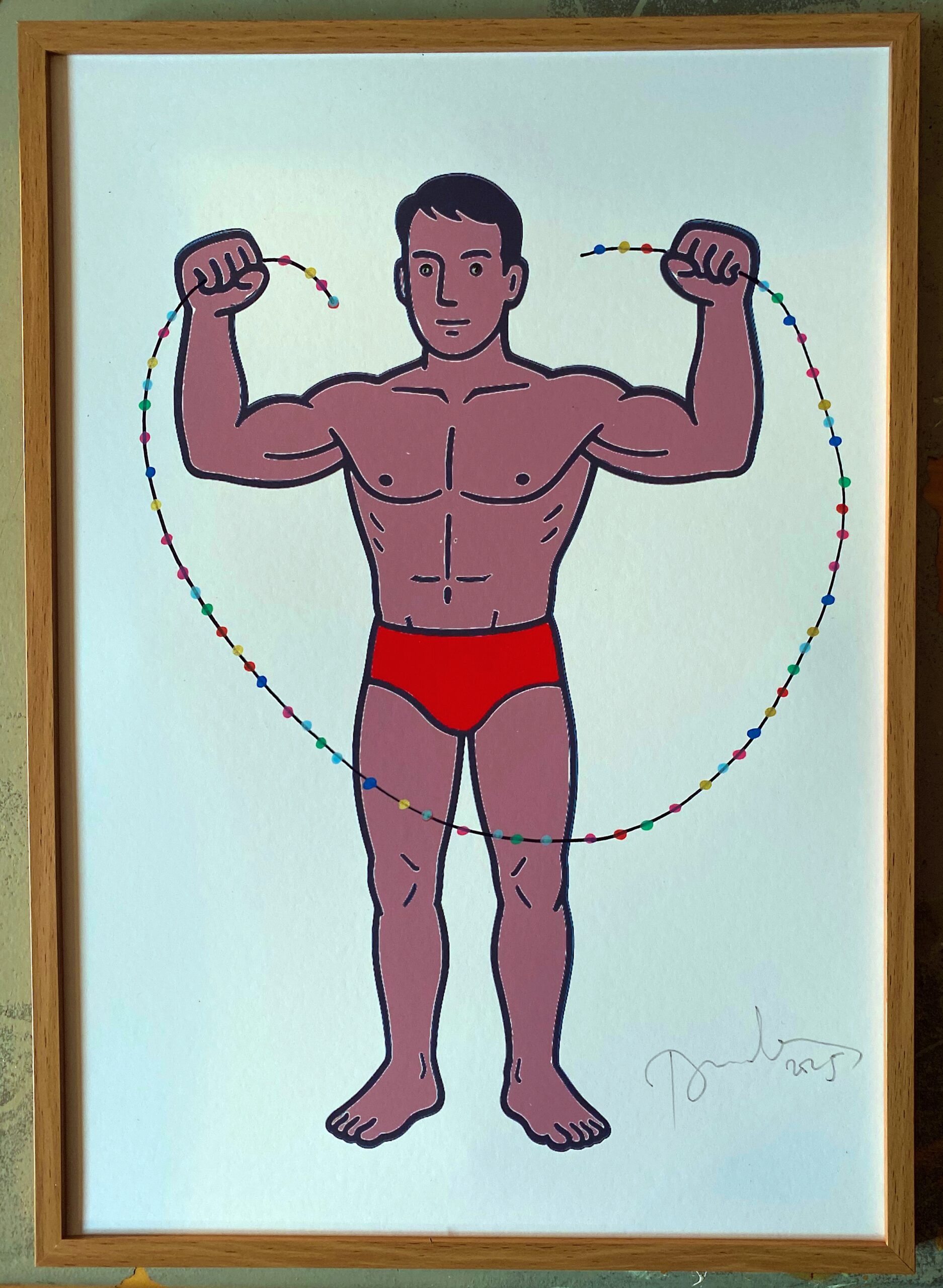 Dans la série Les Beaux Nageurs, « Un beau nageur de couleur et son fil de perles multicolores » création unique 2025 . Impression jet d’encre réhaussé avec des feutres de couleurs diverses, sur papier photo mat Ilford Studio, format A4, 235 g/m², à séchage instantané (« Instant Dry »), sur base RC (Resin Coated) . Cadre sur demande.