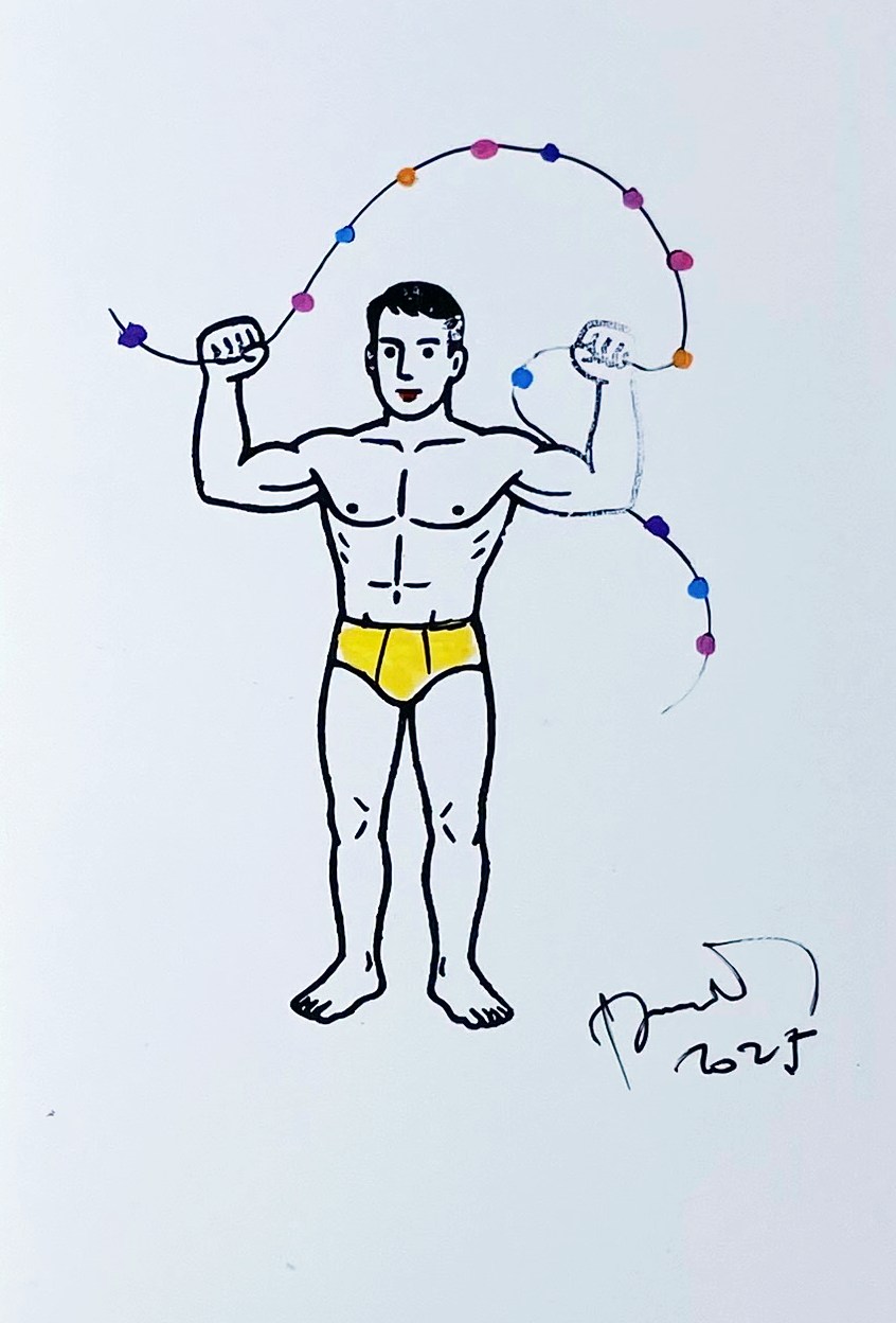 Dans la série Les Beaux Nageurs : Petit format et pièce unique représentant un beau nageur en slip kangourou jaune et fil à perles de couleurs. Tampon, encre noire et feutre sur papier photo brillant. Daté et signé. Format encadré 16,5 cm x 11,5 cm, vendu avec cadre noir