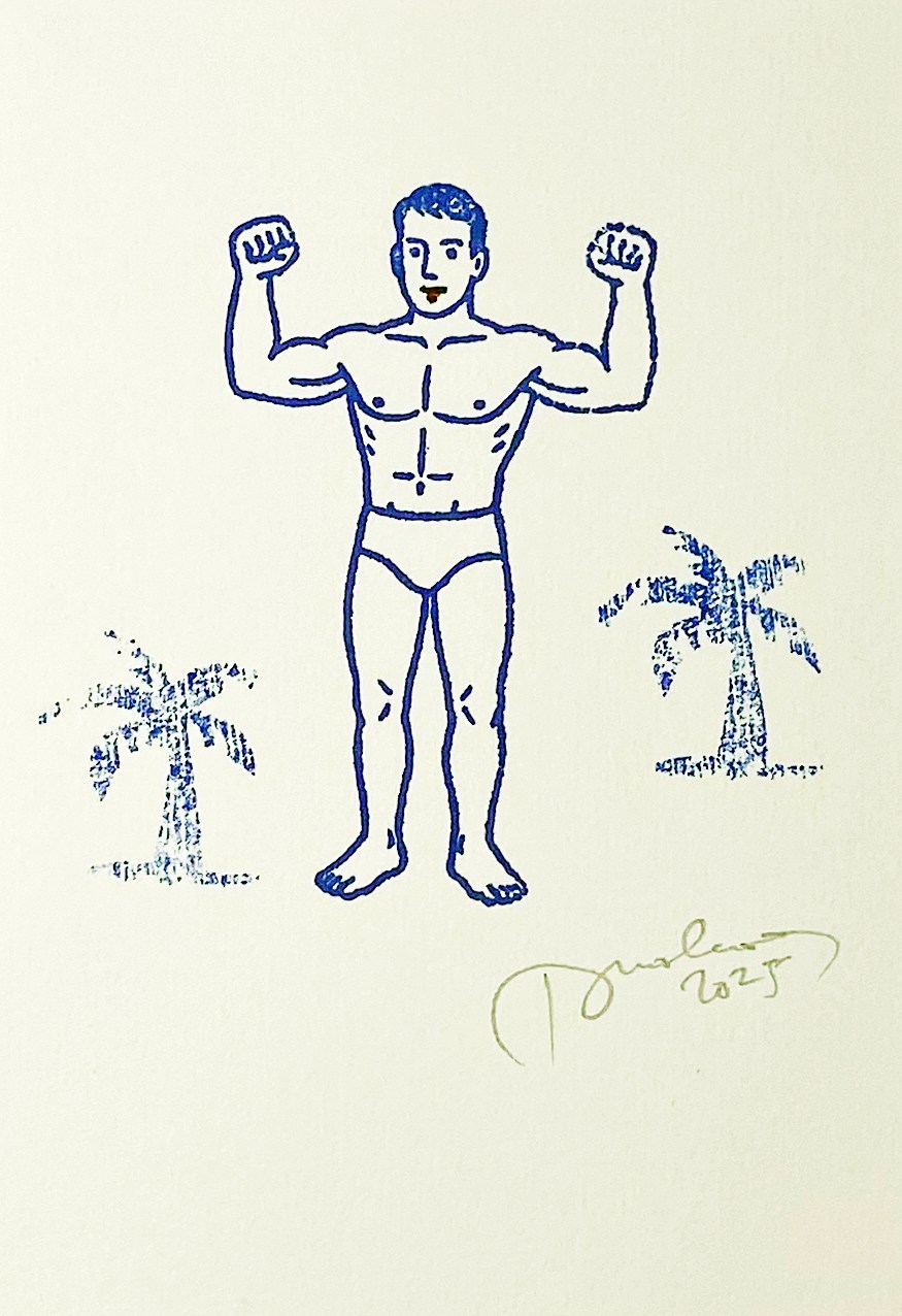 Dans la série les cartes postales uniques , ce nageur réalisé à partir d’une empreinte à l’encre bleue est entouré de 2 palmiers réalisés selon le même procédé. feutre pour le rouge aux lèvres. Papier dessin aquapad de Clairefontaine. 10,5 cm x 14,8 cm 300 g/m2. Vendu avec son enveloppe et une poche de protection.